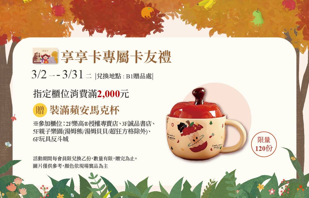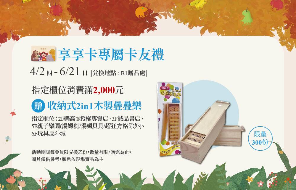 享享卡會員(限單一會員卡號)當日於指定櫃位累計消費滿2,000元,即可兌換專屬卡友禮乙份。