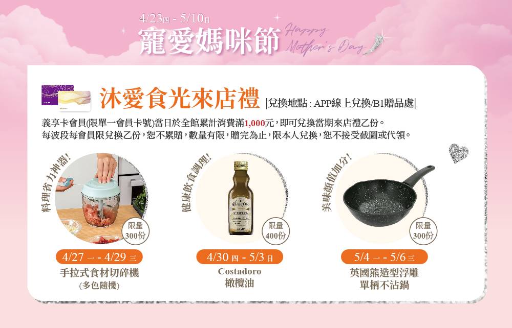 義享卡(限單一會員卡號)當日於全館累計消費滿1,000元,即可兌換當期來店禮乙份。