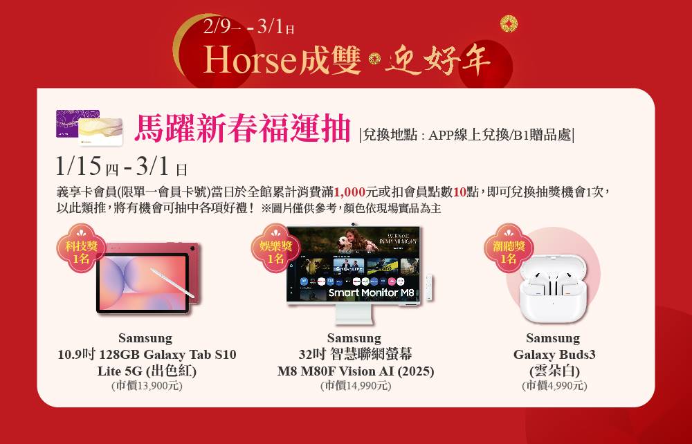 義享卡會員(限單一會員卡號)當日扣會員點數10點或於全館累計消費滿1,000元,即可兌換抽獎機會乙次;扣會員點數20點或累計消費滿2,000元可兌換抽獎機會兩次,以此類推,將有機會可抽中各項好禮!