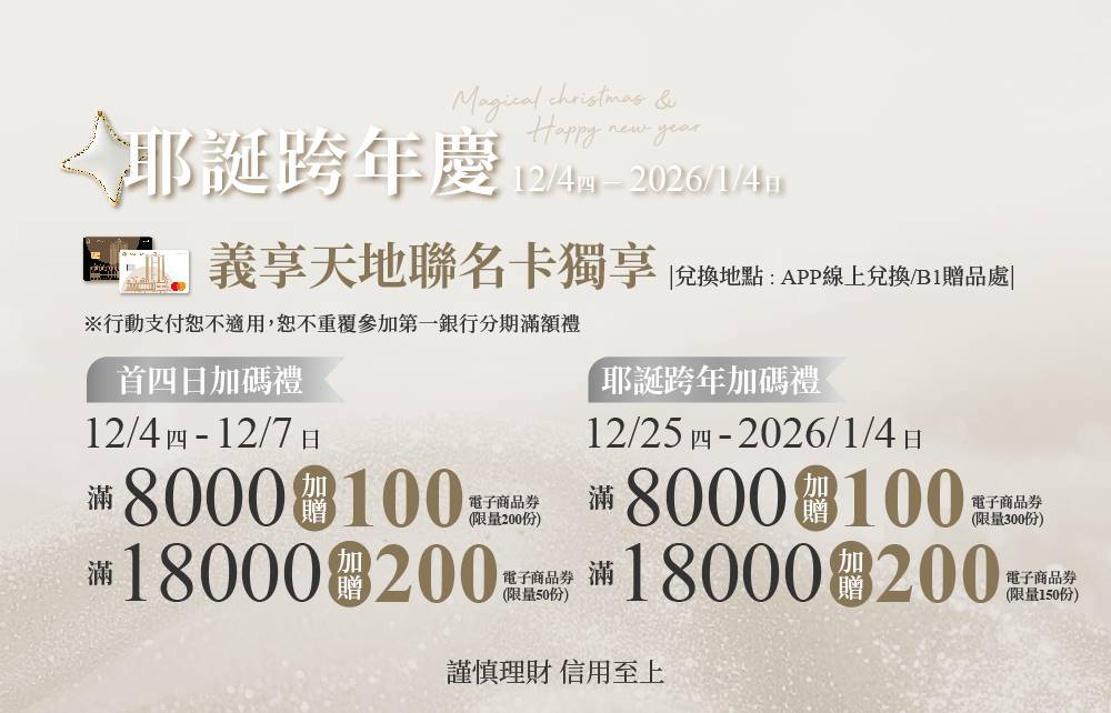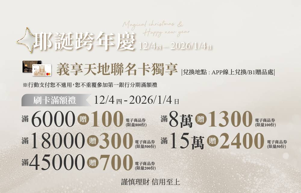 義享卡會員(限單一會員卡號)持第一銀行義享天地聯名卡當日消費達指定門檻,即可憑義享卡、信用卡、同卡號簽單及銷貨明細兌換指定金額電子商品券乙份。限消費當日擇一門檻兌換,每信用卡每日限兌換乙次,恕不累贈。