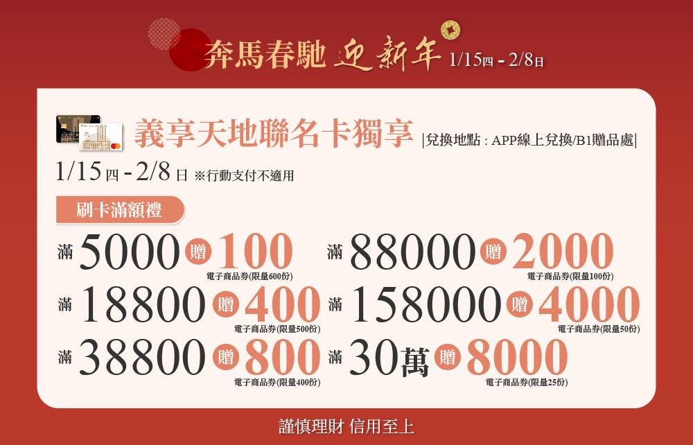 活動期間,義享卡會員(限單一會員卡號)持第一銀行義享天地聯名卡當日消費達指定門檻,即可憑義享卡、信用卡、同卡號簽單及銷貨明細兌換電子商品券乙份。限消費當日擇一門檻兌換,每信用卡每日限兌換乙次,恕不累贈。