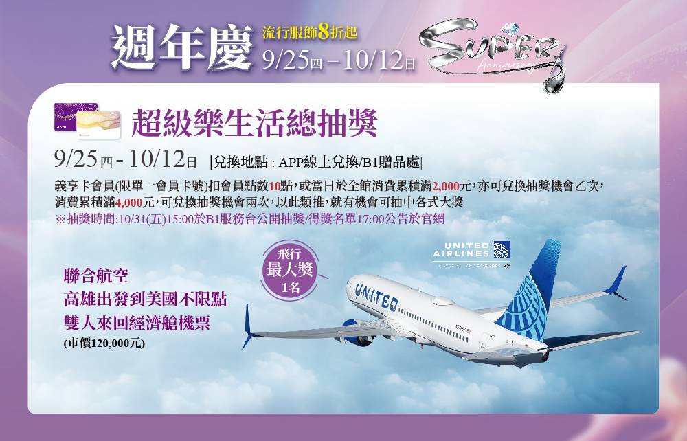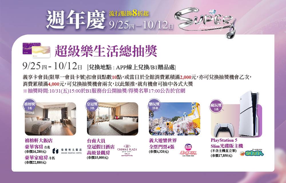 義享卡會員(限單一會員卡號)扣會員點數10點或當日於全館消費累積滿2,000元,即可兌換抽獎機會乙次,扣會員點數20點或消費累積滿4,000元,可兌換抽獎機會兩次,依此類推,將有機會可抽中各式大獎!