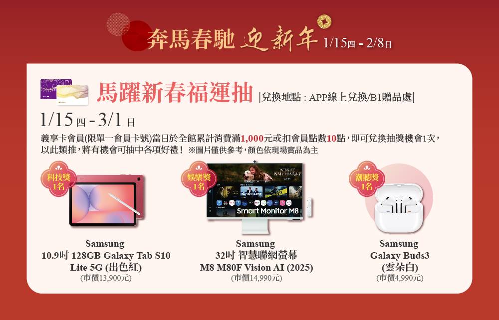 義享卡會員(限單一會員卡號)當日扣會員點數10點或於全館累計消費滿1,000元,即可兌換抽獎機會乙次;扣會員點數20點或累計消費滿2,000元可兌換抽獎機會兩次,以此類推,將有機會可抽中各項好禮!