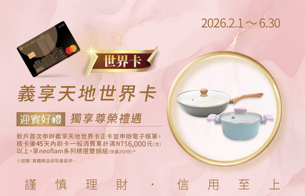 首次申辦第一銀行義享天地聯名卡「世界卡」正卡,並申請電子帳單之新戶,於核卡後45天內累計刷卡消費滿6,000元(含)以上贈「neoflam系列精選雙鍋組」(限量250份)