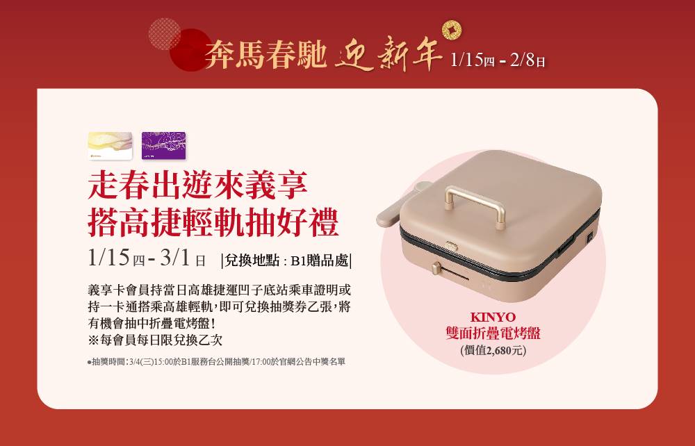 活動說明 義享卡會員持當日高雄捷運凹子底站乘車證明或持一卡通搭乘高雄輕軌,即可兌換抽獎券乙張,有機會抽中摺疊電烤盤!