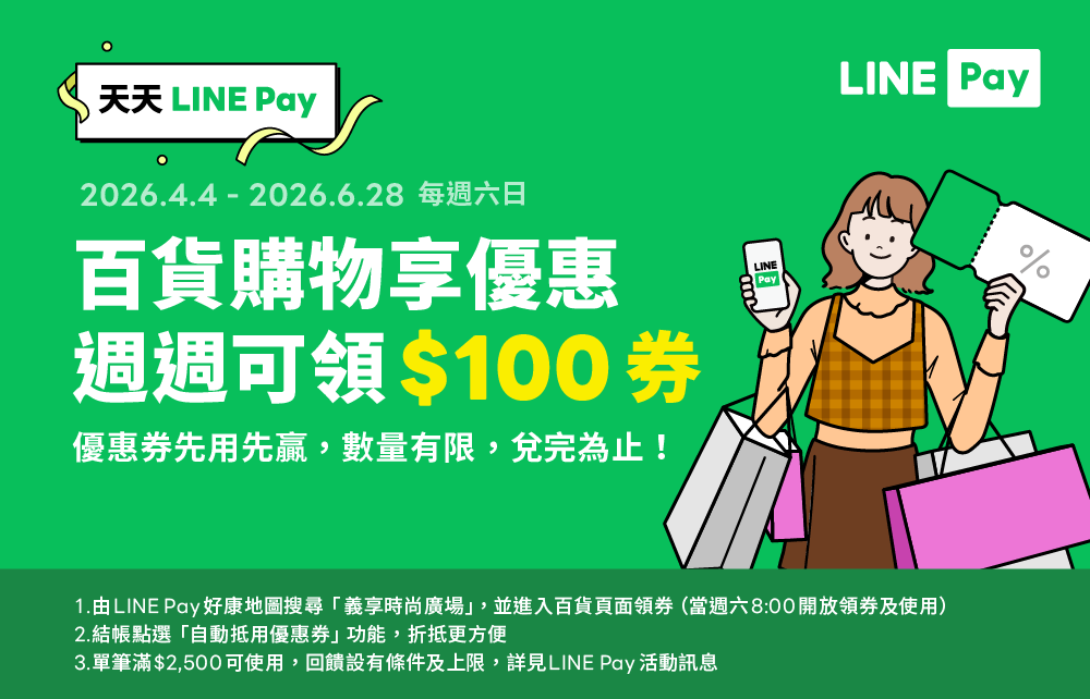 1. 由LINE Pay好康地圖搜尋「義享時尚廣場」,並進入百貨頁面領取100元優惠券 (每週六8:00開放領券及使用)
